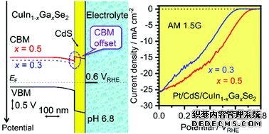Kazunari Domen教授團(tuán)隊(duì)在Energy Environ. Sci.發(fā)文,通過調(diào)控CuIn1-xGaxSe2中 x 的數(shù)值,將獲得的高性能CuIn0.5Ga0.5Se2光陰與BiVO4光陽串聯(lián),獲得了約3.7 %的太陽能轉(zhuǎn)化效率,也是目前的高效率。(上圖,DOI:10.1039/C8EE01783B)