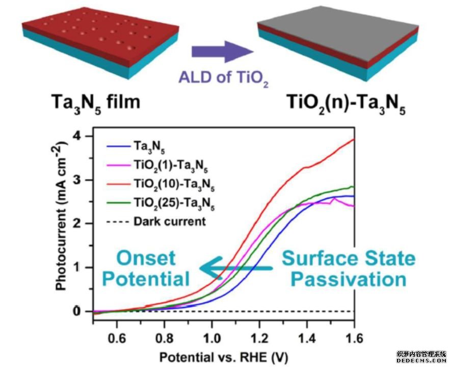 在對(duì)TiO2鈍化層的研究中,羅文俊課題組通過化學(xué)浴沉積的方法在Ta3N5上制備了一層TiO2,并且發(fā)現(xiàn)水溶液法制備的TiO2中含有的羥基基團(tuán)會(huì)影響電的性能。