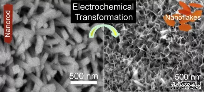 Yat Li課題組通過對(duì)Fe2O3納米棒進(jìn)行電化學(xué)誘導(dǎo),生成了約10 nm 厚的納米片狀Fe2O3,其光電流也提高了3倍。(上圖,DOI:10.1016/j.nanoen.2014.12.023)