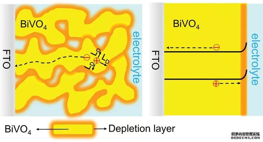 多孔結(jié)構(gòu)的BiVO4電由于減少了反射和透射,對(duì)光的吸收要高于平板結(jié)構(gòu)電。 此外,多孔結(jié)構(gòu)減少了光生空穴的傳輸距離,提高了光生載流子的分離效率,使光電流相比于致密電有了明顯的提高。但多孔結(jié)構(gòu)的光電也不是孔越多越好。 (上圖,DOI:10.1002/aenm.201301785)