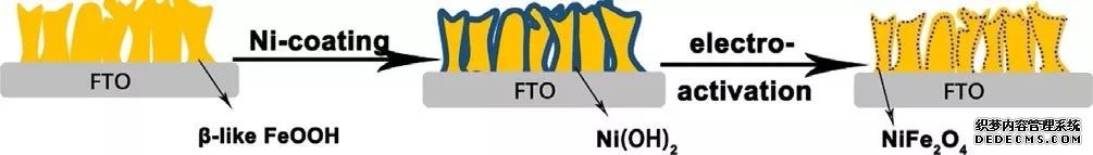 隨后他們制備了亞穩(wěn)態(tài)、大孔道結(jié)構(gòu)的類β相( schwertmannite) FeOOH 薄膜電,并且在其表面負(fù)載了少量 Ni(OH)2。在外加偏壓下,覆蓋在亞穩(wěn)態(tài)類β相FeOOH表面的Ni2+會(huì)以某種離子或離子團(tuán)的形式進(jìn)入到類β相 FeOOH 的結(jié)構(gòu)孔道,與孔道周邊的Fe原子成鍵形成 NiFe2O4,使得雙層催化劑的產(chǎn)氧活性和穩(wěn)定性都大幅提升。α-FeOOH的晶型結(jié)構(gòu)穩(wěn)定,沒有大孔道。因此在外加偏壓下,α-FeOOH/Ni(OH)2并沒有展現(xiàn)出特殊的變化,僅是單純性能的疊加,產(chǎn)氧活性也小于β-FeOOH/Ni(OH)2。因此,在FeOOH、NiOOH雙層電催化劑中,F(xiàn)eOOH 的晶相對(duì)Fe/Ni 雙層結(jié)構(gòu)催化劑的性能有較大影響。(DOI:10.1002/asia.201700964)