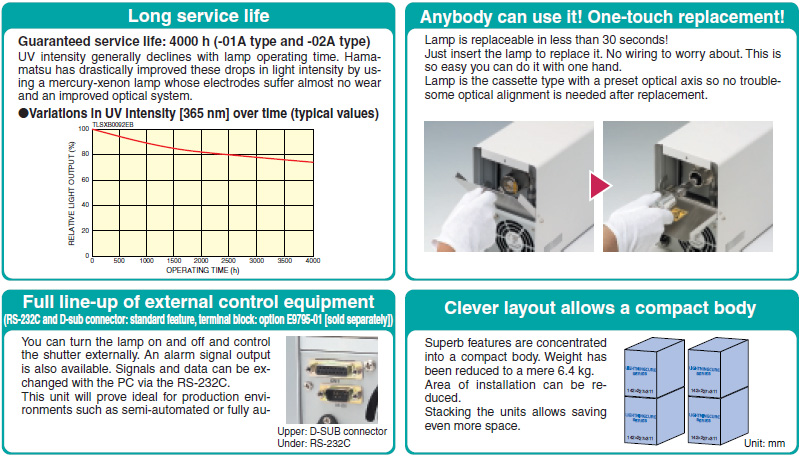 點光源采用長壽命高光強的汞氙燈和光損耗小化的光學(xué)系統(tǒng)。我們的紫外點光源因長壽命和高功率而獲得良好的聲譽,正在各種領(lǐng)域扮演著重要角色,尤其是FA(工廠自動化)。紫外點光源產(chǎn)生更少的熱量,因此能理想用于易熱損的微元件和光學(xué)元件的粘結(jié)時的紫外固化。[光導(dǎo)插口:背面,燈管更換位置:操作面板(前面)]