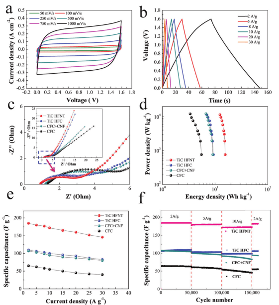 將材料制備成電容器,測(cè)試電容器的循環(huán)伏安曲線,不同倍率下的循環(huán)曲線,倍率曲線,交流阻抗圖譜等相關(guān)測(cè)試。