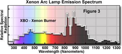 氙燈和汞燈做為白光源,都能提供從紫外到近紅外一系列波長(zhǎng)的光,但它們卻有著不同的激發(fā)光譜。汞燈集中在近紫外、藍(lán)光以及綠光附近,這種在峰值的高激發(fā)能量確保產(chǎn)生明亮的熒光信號(hào),但光毒性卻很強(qiáng)。因此,HBO用來(lái)對(duì)固定樣品或弱熒光成像。相比而言,氙燈光源的激發(fā)比較平緩,可以用于不同波長(zhǎng)間強(qiáng)度的比較,例如用于鈣離子濃度測(cè)量等。氙燈的強(qiáng)激發(fā)在近紅外800-1000nm。