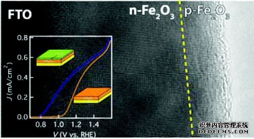 中科院理化所師文生課題組在具有ZnO陣列的FTO上,用電沉積的方式制備了FeOOH,通過高溫離子擴(kuò)散的方式使Zn2+摻雜入Fe2O3, 后去除ZnO模板獲得了p型Zn2+摻雜Fe2O3的空心納米管光陰,并展現(xiàn)出了較高的開啟電勢(shì)。(上圖,DOI:10.1039/C3CC40599K)