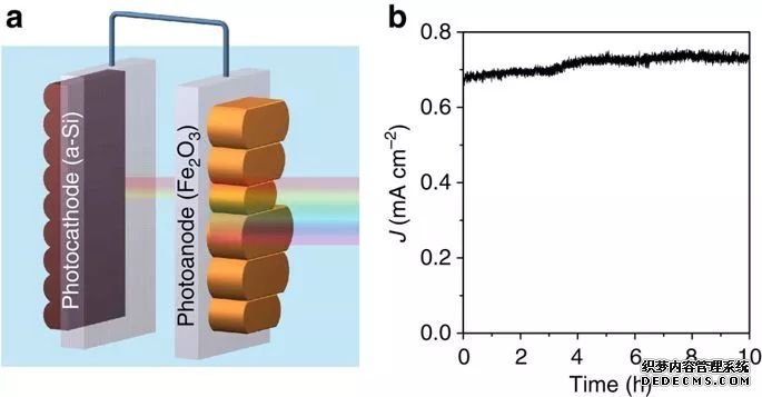 Dunwei Wang課題組發(fā)表在Nature Communications的一篇工作中,在通過Fe2O3光陽和非晶Si光陰組成的器件,獲得了當(dāng)時(shí)高約0.9%的太陽能轉(zhuǎn)化效率;(上圖,DOI:10.1038/ncomms8447)