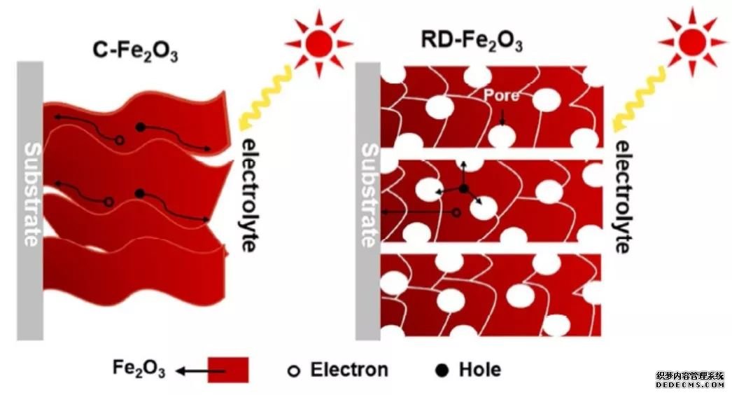 但是,F(xiàn)e2O3同時(shí)也存在著吸光系數(shù)差、光生空穴傳輸距離短(2~4 nm) 等限制因素,導(dǎo)致了目前基于Fe2O3光陽的光電轉(zhuǎn)化效率依舊較低。由于Fe2O3的空穴傳輸距離太短,因此對(duì)Fe2O3的微納結(jié)構(gòu)調(diào)控顯得尤其重要。