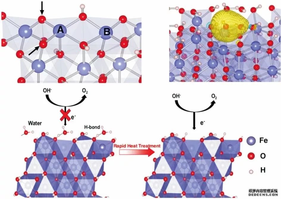 羅文俊課題組發(fā)現(xiàn)通過高溫短時(shí)間煅燒除去α-FeOOH 表面吸附水的方法,可以提高α-FeOOH 的產(chǎn)氧活性和穩(wěn)定性,通過理論計(jì)算發(fā)現(xiàn),表面吸附水會(huì)與FeOOH 表面的O形成強(qiáng)的氫鍵,影響活性位點(diǎn)對(duì)OH- 的吸附和氧化,從而影響了其產(chǎn)氧的活性。 (DOI:10.1039/C6TA08719A)