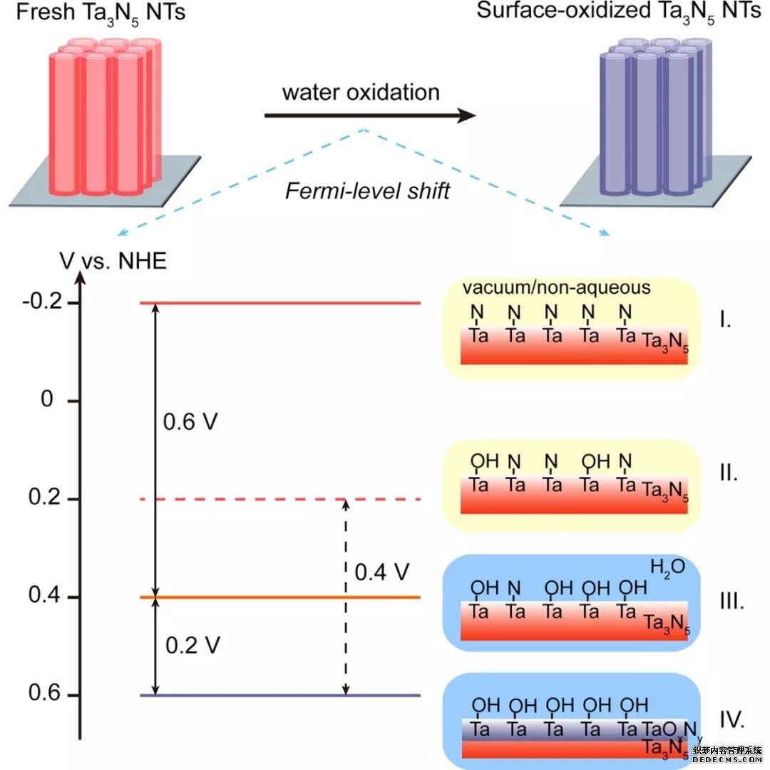 Dunwei Wang課題組在Chem發(fā)文,發(fā)現(xiàn)在光電化學(xué)分解水過程中,Ta3N5的表面會(huì)自氧化生成一層非 晶的富氧層,導(dǎo)致費(fèi)米能級(jí)下降,終導(dǎo)致其性能衰減。 因此,對(duì)Ta3N5的表面進(jìn)行鈍化處理,不僅能提高性能,對(duì)其長期穩(wěn)定性的提高也十分重要。